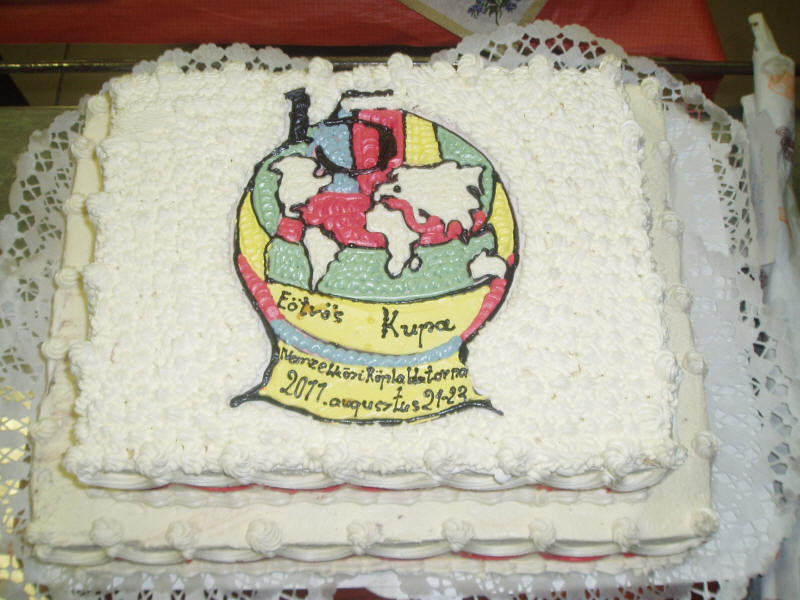 A baráti beszélgetésen elfogyasztott 100 szeletes torta, a torna logójával.